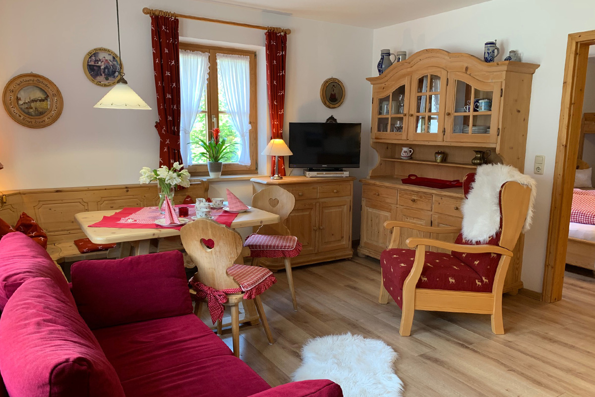 Großzügig, hell im Erdgeschoss mit Südterrasse. Gemütliches Wohnzimmer bayerisch eingerichtet mit Eckbank, Sofa, Fernsehsessel und Kochnische. Schlafzimmer mit großem Doppelbett und Kinderstockbett Ideal für eine Familie mit 2 Kindern ( bis 12 Jahren) Badezimmer modern neu ausgestattet.